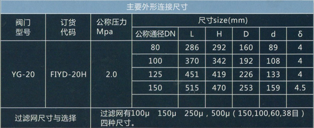 FI表示過(guò)濾器,Y表示結(jié)構(gòu)形式為直流式,D表示對(duì)焊連接,20代表公稱(chēng)壓力為2.OMPa,H代表殼體材質(zhì)為鋼質(zhì)焊接。