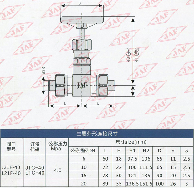 適用范圍 適用于公稱壓力為PN4.0MPa,公稱通徑為DN6、DN10、DN15和DN20,進出口螺紋連接閥體材料為鋼質(zhì)的直通截止閥和節(jié)流閥?! ¢y門屬性 公稱壓力為PN4.0MPa,試驗壓力為PN6.0MPa,適用溫度為-50°C-+200°C適用介質(zhì)為氨、氟等。 J表示截止閥 L表示節(jié)流閥 T表示結(jié)構(gòu)形式為直通式 G表示管接頭連接 40代表公稱壓力為4.0MPa,40后不標注代表代表閥體材質(zhì)為鍛鋼。